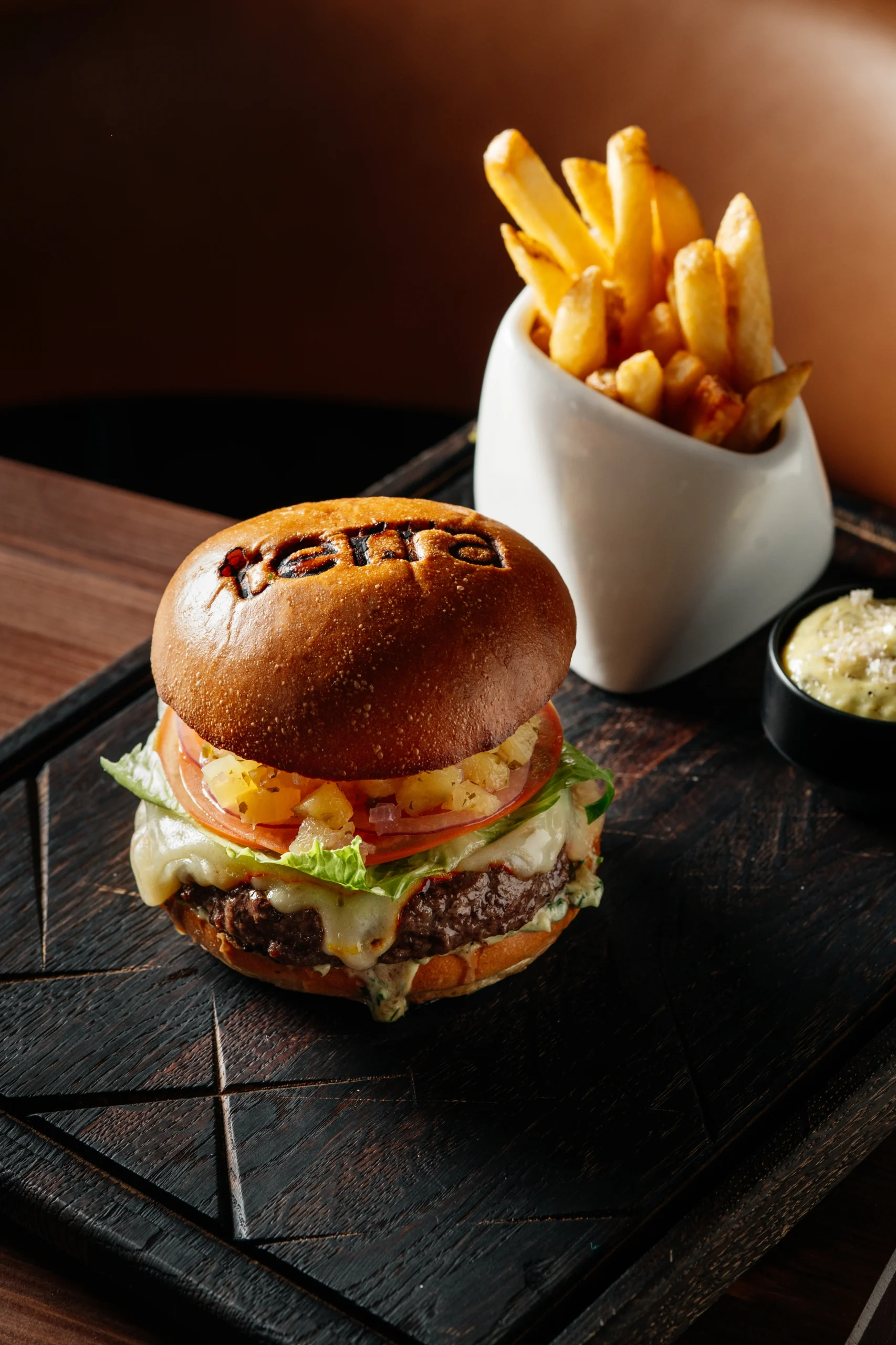 Wagyu beef patty with pineapple chutney, tartar sauce, cheese, lettuce, tomato, red onions. Served with fries, house truffle aioli