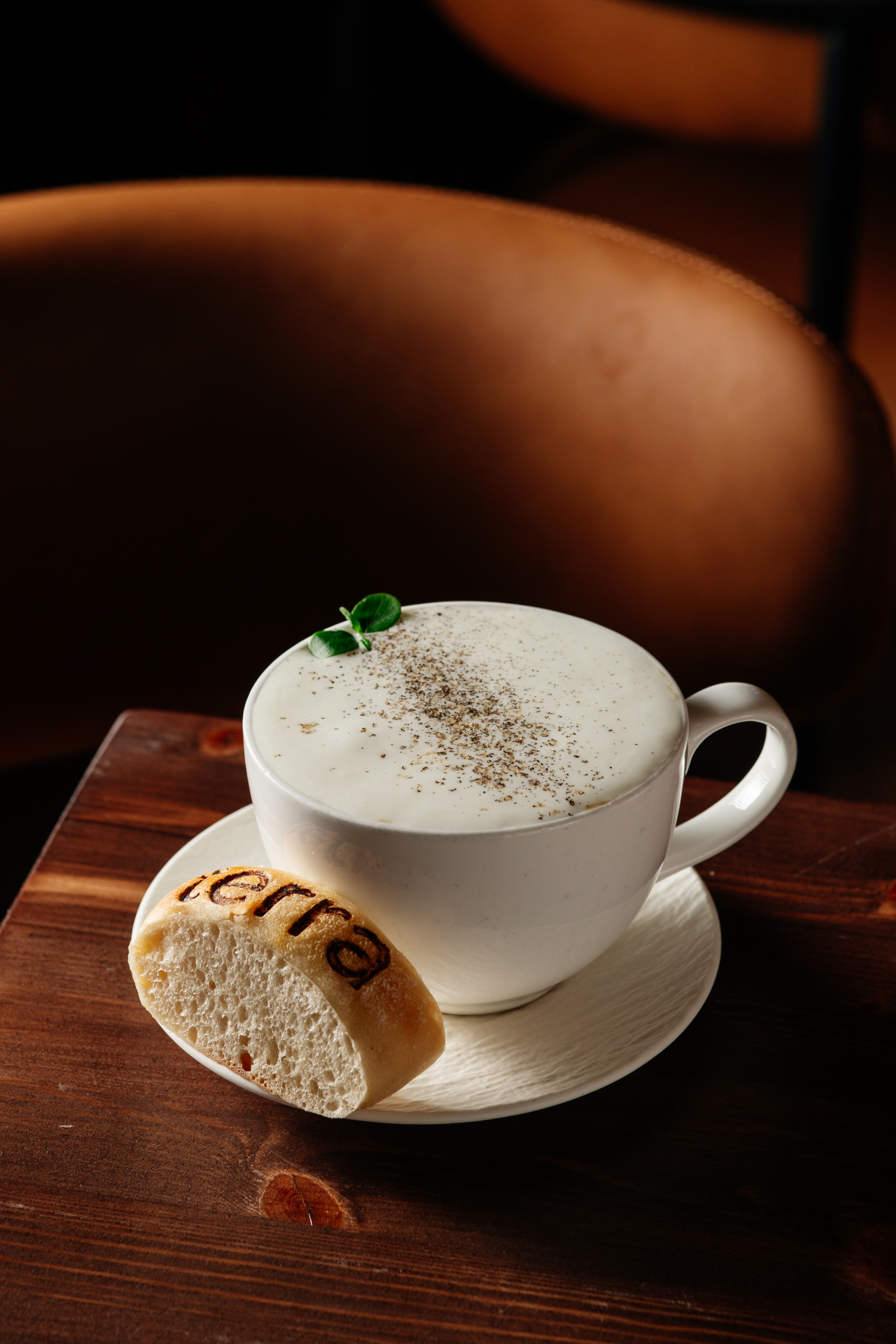 Creamy mushroom soup with milk foam, grated black truffle, and served with a warm bread roll